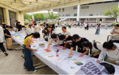 “平时总在课本里看祖国的美景,今天能用画笔把它画出来,感觉特别有意义。”参与活动的同学说,绘制过程中,他和身边的同学交流各地风光,更真切地感受到祖国的辽阔与美好。举办此次活动,不仅欢庆国庆,更以彩绘为纽带,让师生在互动创作中传承传统文化、抒发爱国情感,同时丰富校园文化生活,增强师生间的凝聚力。活动持续至下午6时,两幅满载心意的“祖国山河图”最终完成,成为新大活一楼最亮眼的风景。此次彩绘活动,以生动有趣的形式将家国情怀融入艺术创作,让师生在动手实践中感受祖国之美、时代之变,不仅为国庆佳节增添了浓厚的文化氛围,更在校园里种下了热爱祖国、建设祖国的种子,为新学期的校园生活注入了温暖的精神力量。
