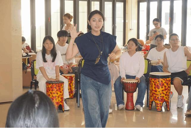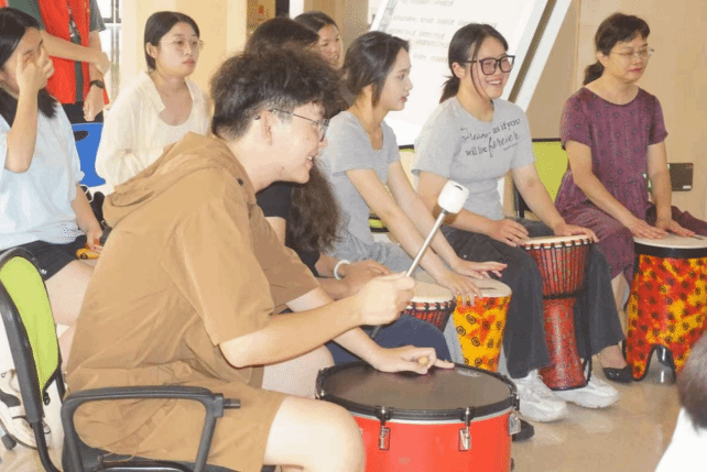 活动现场,同学们围坐成圈,手持各类打击乐器。“不要在意对错,只需感受节奏带来的快乐。”在引导师的鼓励下,同学们逐渐放开束缚,用乐器表达自己的情绪,感受节奏的律动与音乐的治愈力量。从轻柔的敲击到激昂的合奏,参与者们通过触觉、听觉和情感的联动,逐渐放松身心,释放内心的压力。大家相互配合,即兴创作,共同演绎出充满活力的音乐篇章。