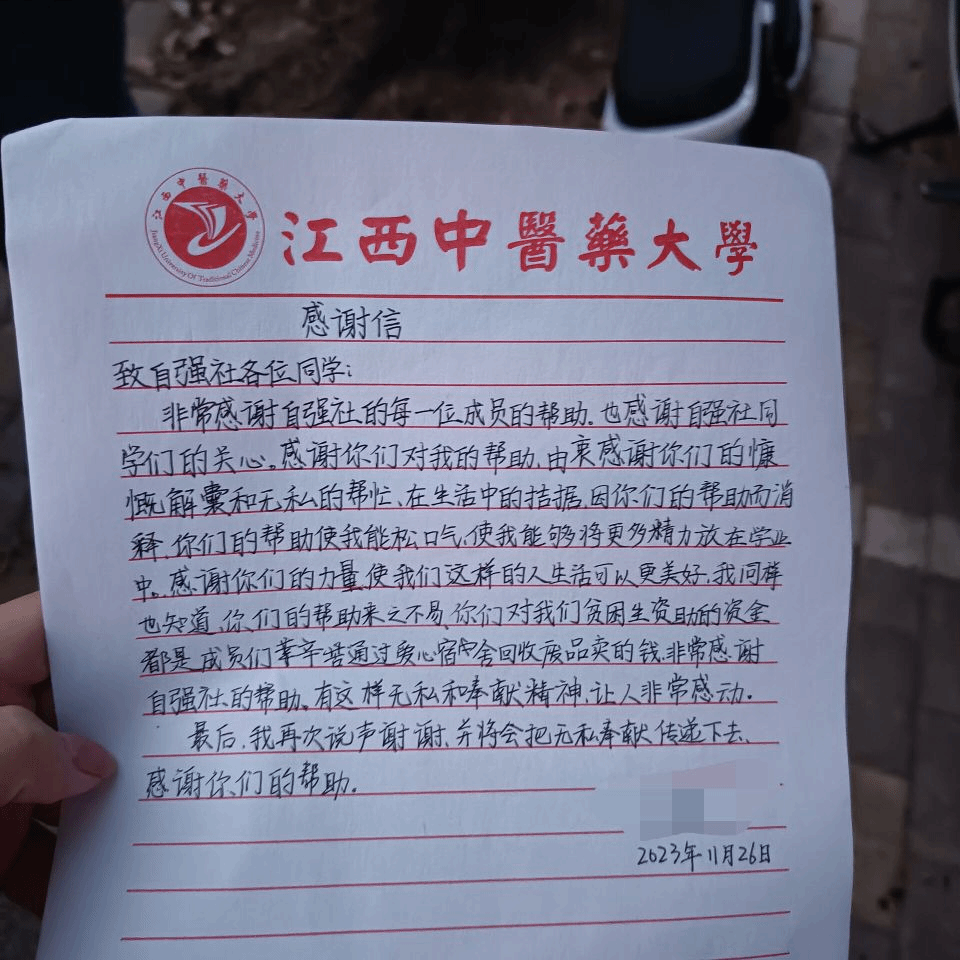 11月27日晚六点,指导老师与社团主要理事前往宿舍看望受到“爱心宿舍帮扶的学生,鼓励其好好读书,弘扬向善精神。受资助同学也表达了对自强社活动的钦佩和赞赏,表示会弘扬爱心精神,勤奋读书,做一名能发光发热的人。他在给自强社的感谢信中写道“感谢社团的慷慨解囊和无私的帮助。让我可以有更多的时间和精力放在学业中。