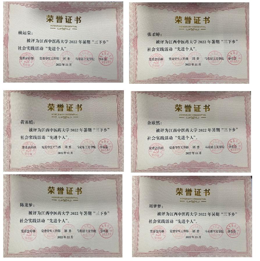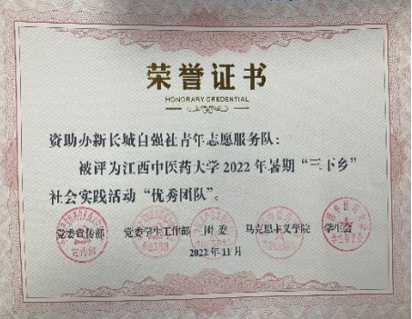202211月,由江西中医药大学党委宣传部、党委学生工作部、团委、马克思主义学院、学生会经过评比,最后资助办新长城自强社青年志愿服务队荣获 “优秀团队”,其中团队老师赖运荣,黄苏娟老师,团队成员张柔婷、陈龙梦、刘梦梦、余欣然都荣获“优秀个人”称号。