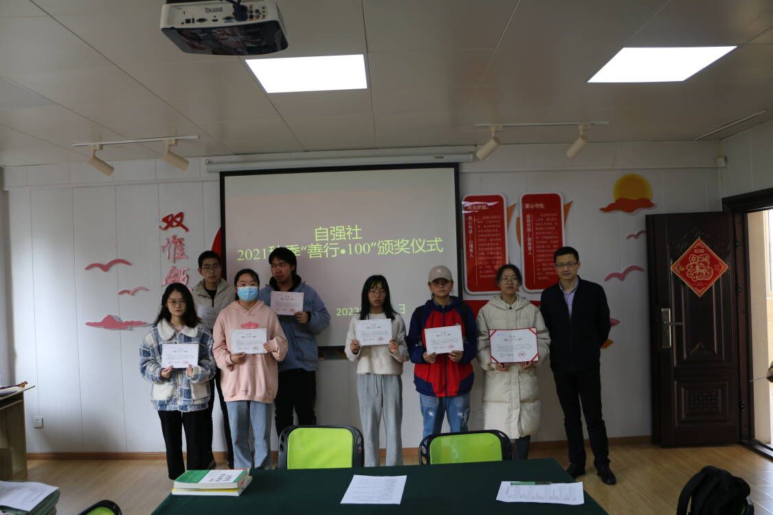 江中新闻网讯(通讯员 徐彩轩 赖运荣)3月7日中午,新长城自强社在商城307会议室举行2021年“善行100”荣誉颁发仪式。自强社指导老师、受到表彰的部分学生代表和自强社成员参加了本次活动。