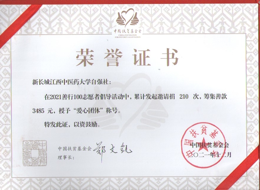 聂迎春等14名志愿者因表现突出,荣获由中国扶贫基金会授予的“‘善行100’优秀志愿者”荣誉证书。新长城江中自强社荣获“爱心团体”称号。