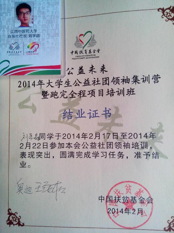 江中新闻网讯(通讯员 李水明)在校学生资助管理办公室的大力支持下,2014年2月17日至2月22日我校“新长城江中自强社”负责人参加了由中国扶贫基金会在北京主办的 “公益未来-2014年大学生公益社团领袖集训营暨跑完全程项目培训班”,接受了为期一周的封闭式集训。