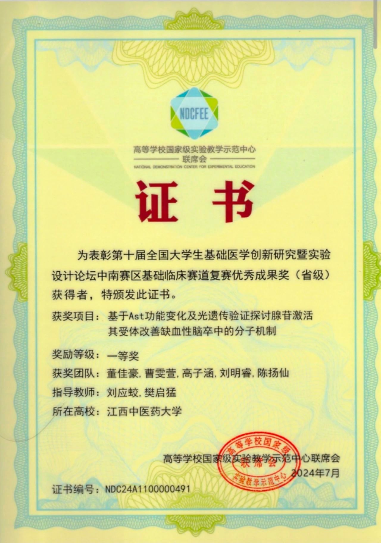 1、荣获第十届全国大学生基础医学创新研究暨实验设计论坛省级一等奖