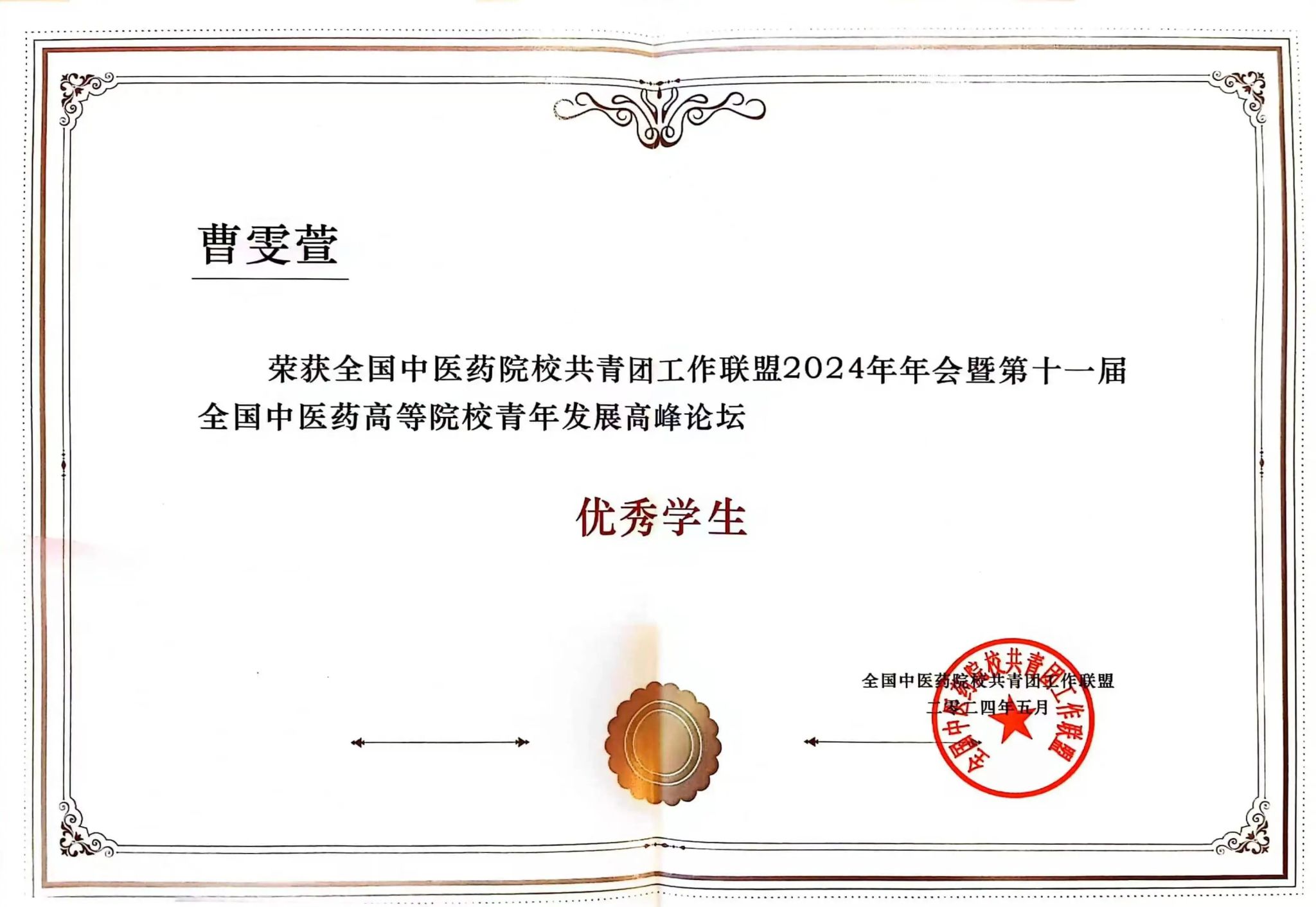 2、荣获全国中医药院校共青团工作联盟2024年年会暨第十一届全国中医药高等院校青年发展高峰论坛“优秀学生”