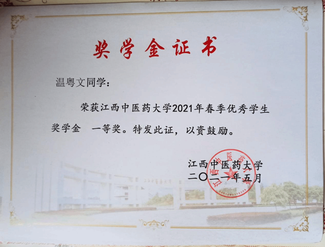 温粤文同学始终牢记:学习是学生的第一要务。在过去的两年中,她刻苦学习,努力务实,抓紧分分秒秒努力学习专业知识,连续两年必修课平均分达到专业第一,一共获得三次一等奖学金和一次二等奖学金。