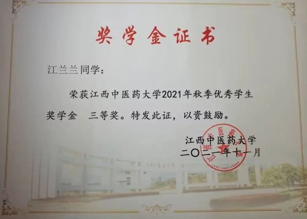6. 荣获江西中医药大学2021年秋季优秀学生奖学金三等奖