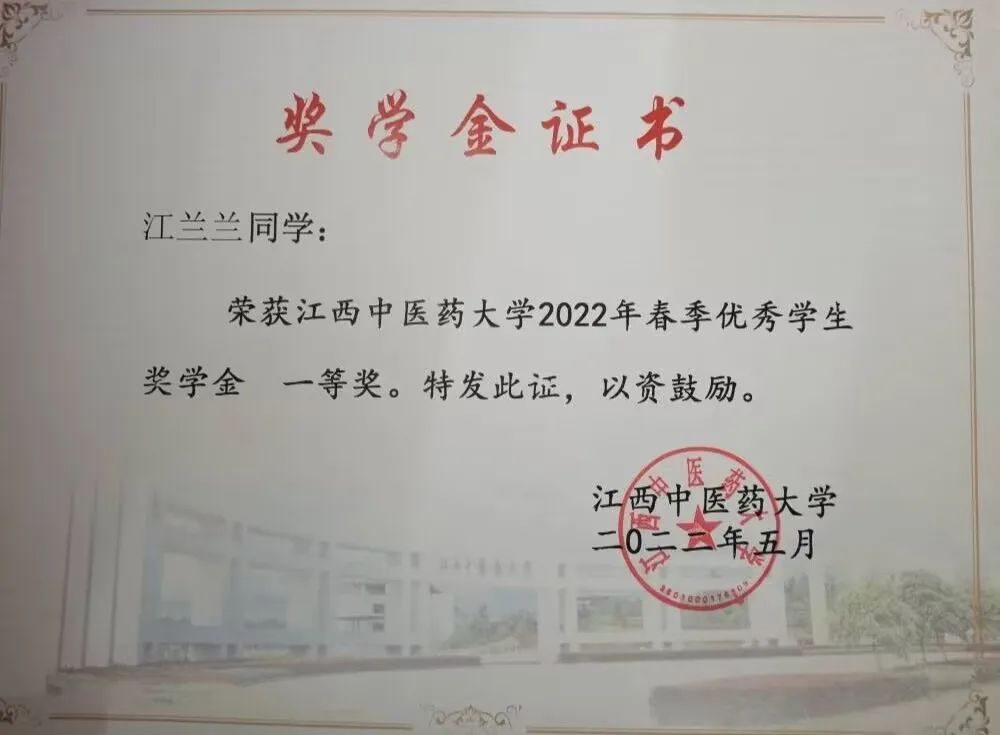 4. 荣获江西中医药大学2022年春季优秀学生奖学金一等奖