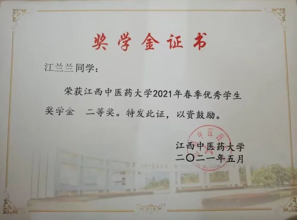 5. 荣获江西中医药大学2021年春季优秀学生奖学金二等奖