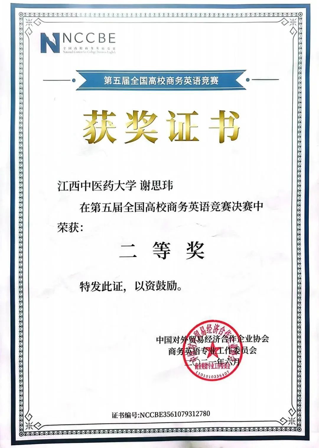 2.荣获2021年第五届全国高校商务英语竞赛决赛二等奖