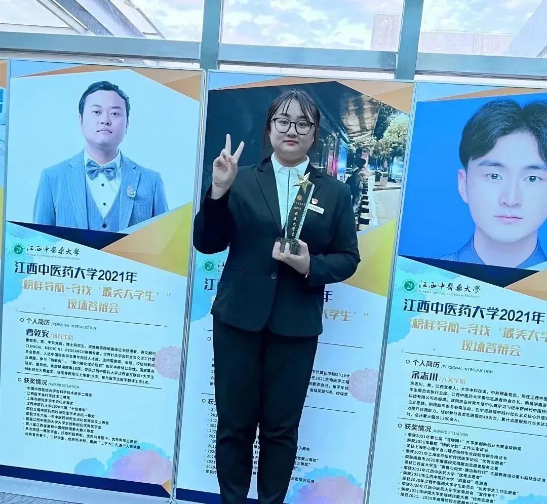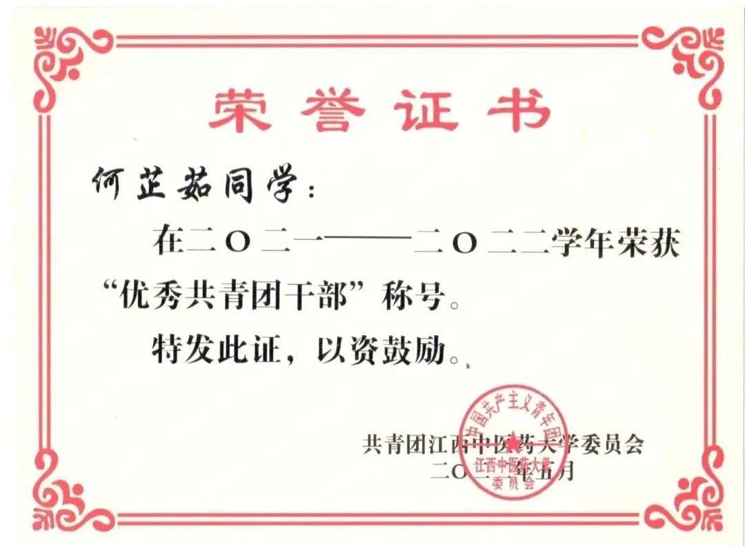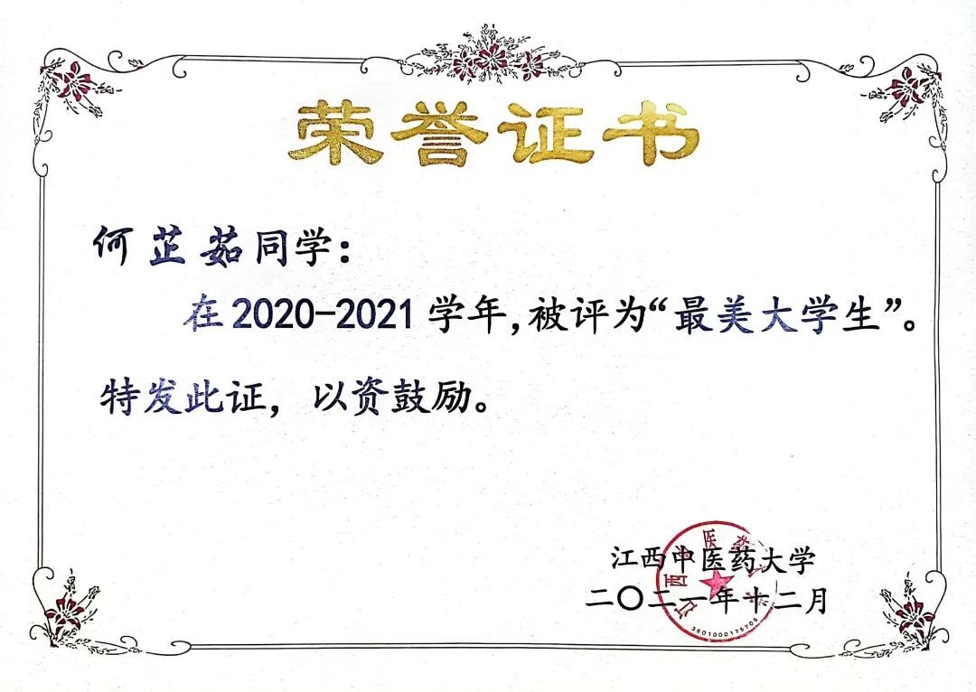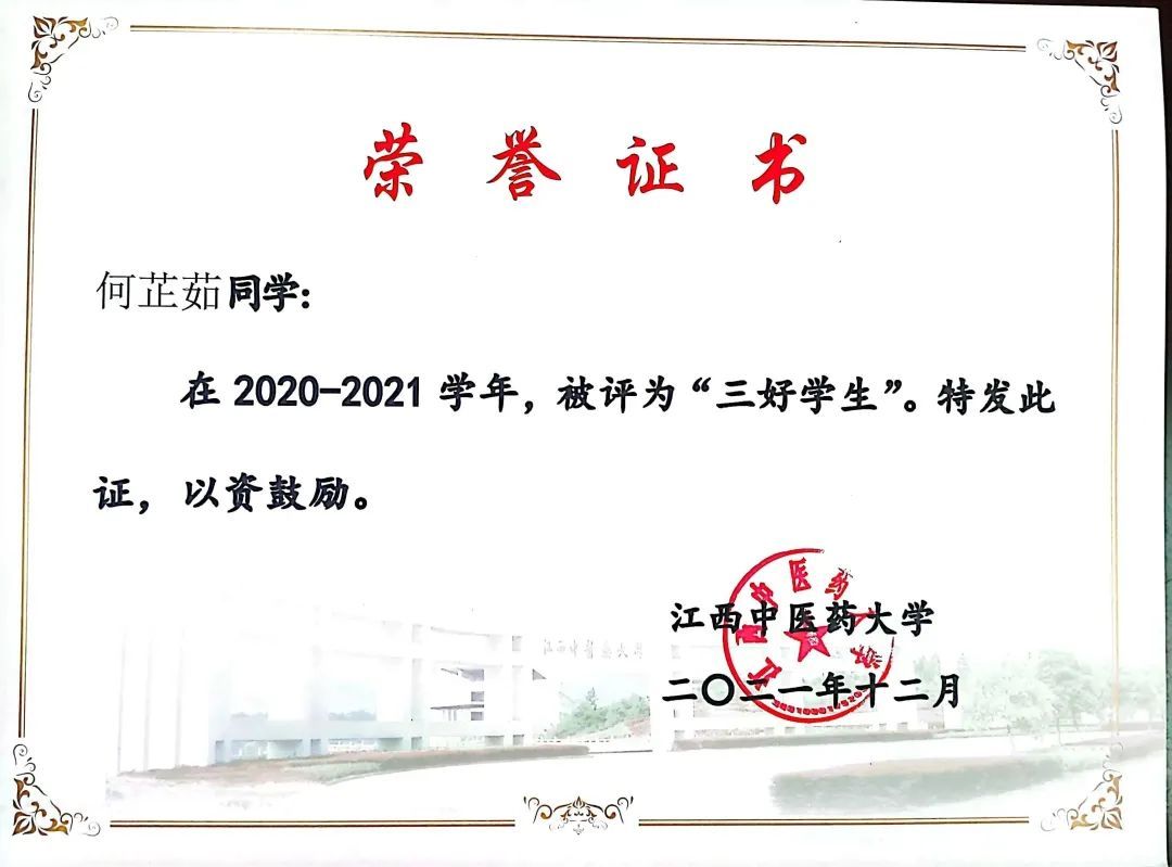 1 铭初心,思想上进勤修行。作为一名中共党员,何芷茹同学时刻严格要求自己,积极向上,荣获2021年度江西中医药大学学生党员“先锋岗”。