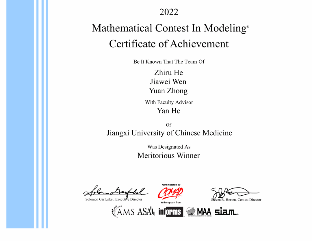 1.荣获2022年美国(国际)大学生数学建模竞赛一等奖
