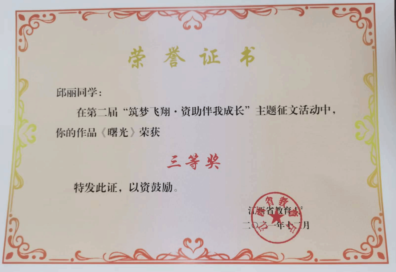 邱丽“曙光”三等奖