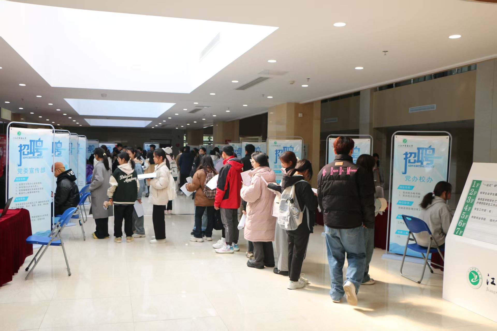 江中新闻网讯(通讯员 王默 赖运荣)为保障家庭经济困难学生公平参与勤工助学实践锻炼,提升学生求职能力和综合素质,充分发挥勤工助学的育人功能,3月7日下午,学生资助管理办公室在大学生创新发展中心一楼大厅举办2025年春季勤工助学“双选会”。图书馆、教务处、学工处等20余个用工部门的招聘老师和100余名申请勤工助学的学生参加了本次“双选会”。