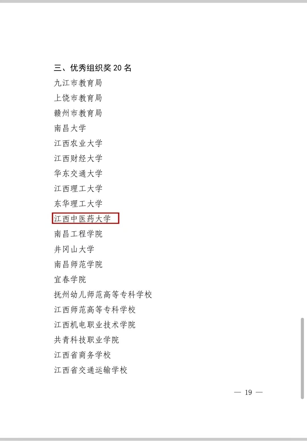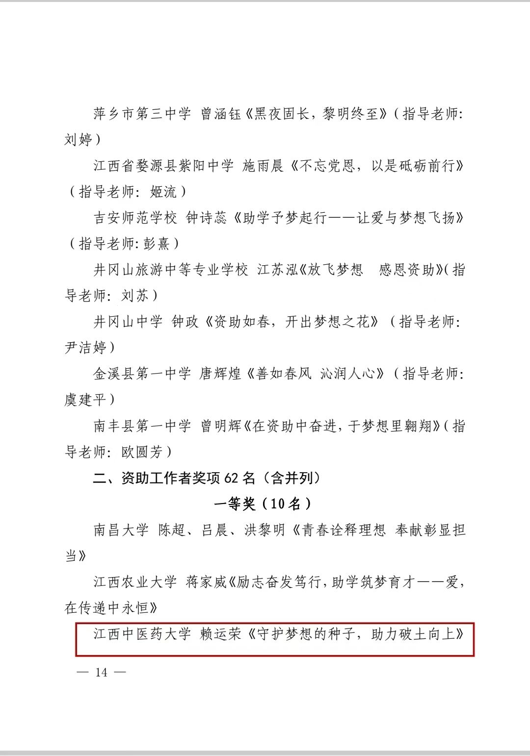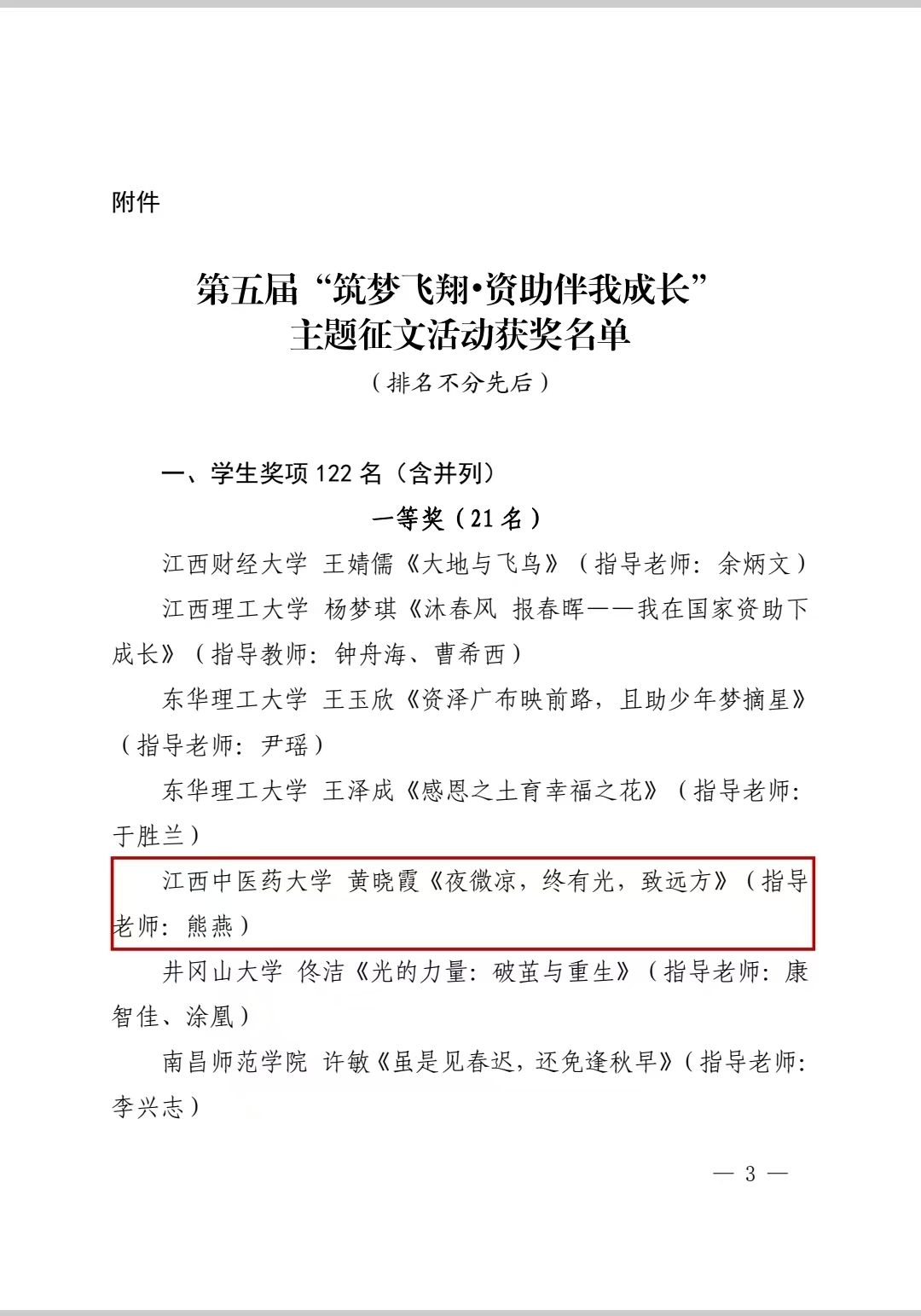 (通讯员 黄苏娟)近日,江西省教育厅公布第五届“筑梦飞翔·资助伴我成长”主题征文活动获奖结果,我校针灸推拿学院黄晓霞同学作品《夜微凉,终有光,致远方》(指导老师:熊燕)荣获学生组一等奖、赖运荣老师作品《守护梦想的种子,助力破土向上》荣获教师组一等奖,同时我校荣获优秀组织奖。本次活动,省教育厅面向各设区市教育局、各高等院校和省属中职学校共征集参赛作品491篇,经过省级专家评审、评审委员会审定,最终评出奖项 204 个(含并列),其中学生奖项122个,教师奖项 62个,优秀组织奖20个。