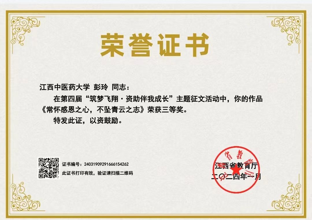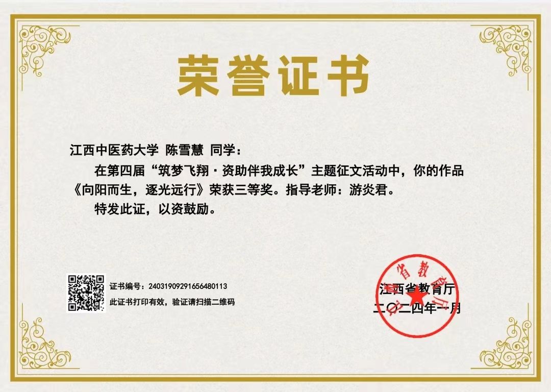 由江西省教育厅组织的第四届“筑梦飞翔·资助伴我成长”主题征文活动评选结果揭晓,我校1名教师,1名学子喜获佳绩。临床医学院陈雪慧的《向阳而生,逐光远行》荣获三等奖(指导老师:游炎君),经济与管理学院彭玲的《常怀感恩之心,不坠青云之志》荣获三等奖。学校荣获“优秀组织奖”。