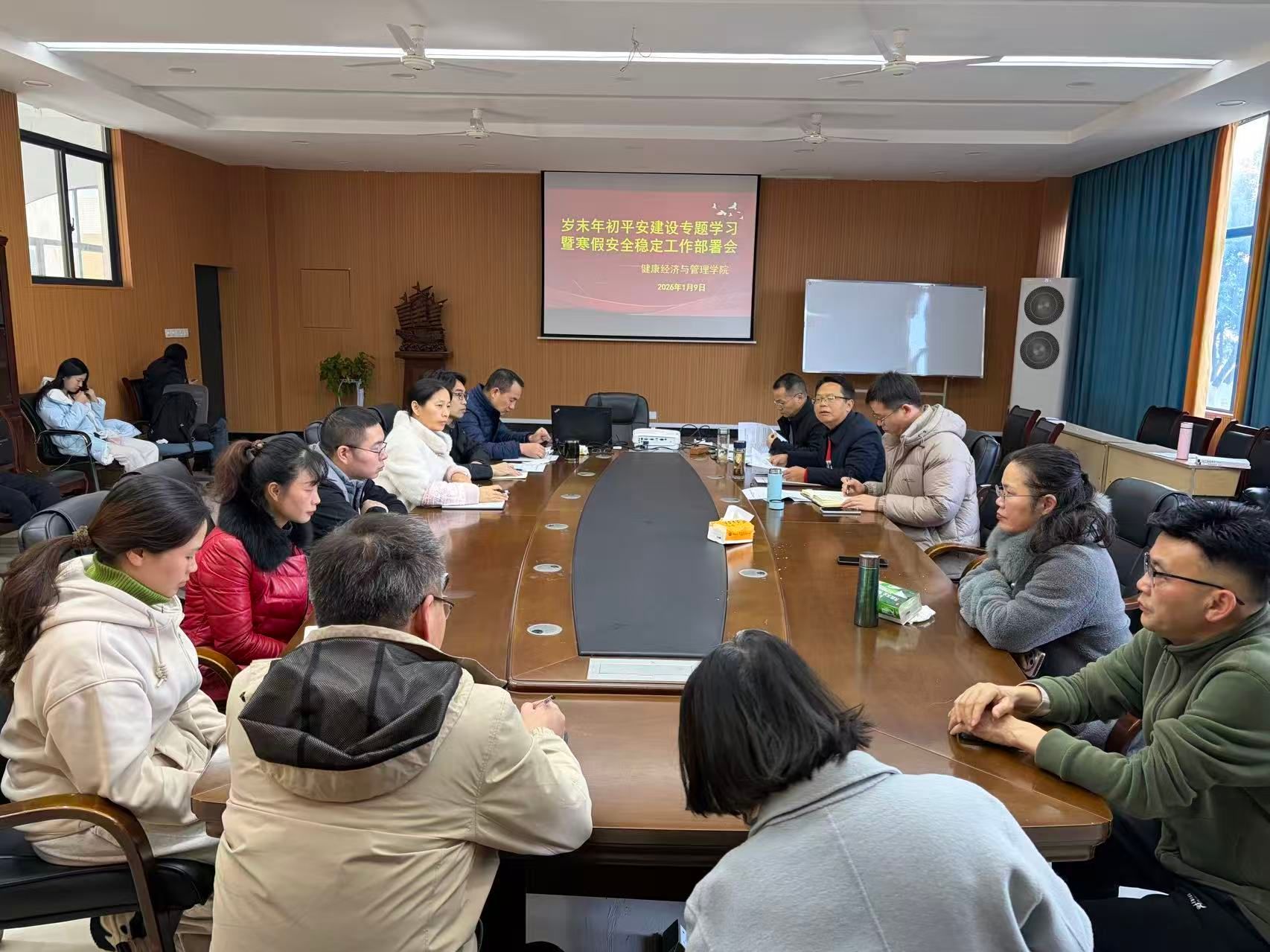 1月9日下午,学院召开教职工岁末年初平安建设专题学习暨寒假安全稳定工作部署会,会议首先传达学校《关于做好2026年寒假及春节期间安全稳定工作的通知》主要精神,重点解读“提升思想认识压实责任、聚焦重点领域排查隐患、强化教育引领提升意识、严格管理保障留校师生、严格值班值守应急处置”五大任务,要求落实“党政同责、一岗双责”“三管三必须”原则。随后集体学习全省学校安全稳定视频会精神,通报近期省内外安全事故案例。教职工围绕“办公室用电安全长效管理”“学生假期防诈骗教育创新”等主题展开讨论,进一步强化了全体师生的安全责任意识,明确了寒假期间值班值守、应急处置等工作细则。