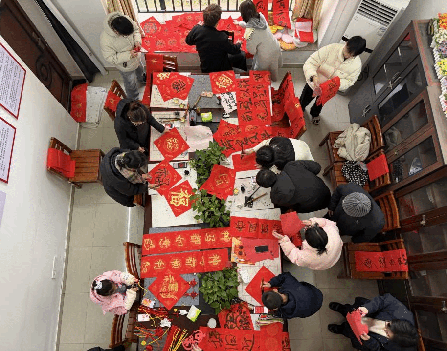 各体验区域分工明确、热闹有序。写春联区域,书法爱好者凝神挥毫,笔墨流转间,一幅幅字迹工整、寓意吉祥的春联渐次成型;剪窗花区域,同学们手持剪刀,红纸在指尖翻转跳跃,精致的福字、灵动的小马等图案跃然纸上;扭扭棒制作区则创意十足,色彩鲜艳的扭扭棒被同学们巧妙打造成绽放的烟花、精致的灯笼等挂件。大家不时相互交流技巧、分享创作心得,现场满是欢声笑语,洋溢着轻松愉悦的节日氛围。