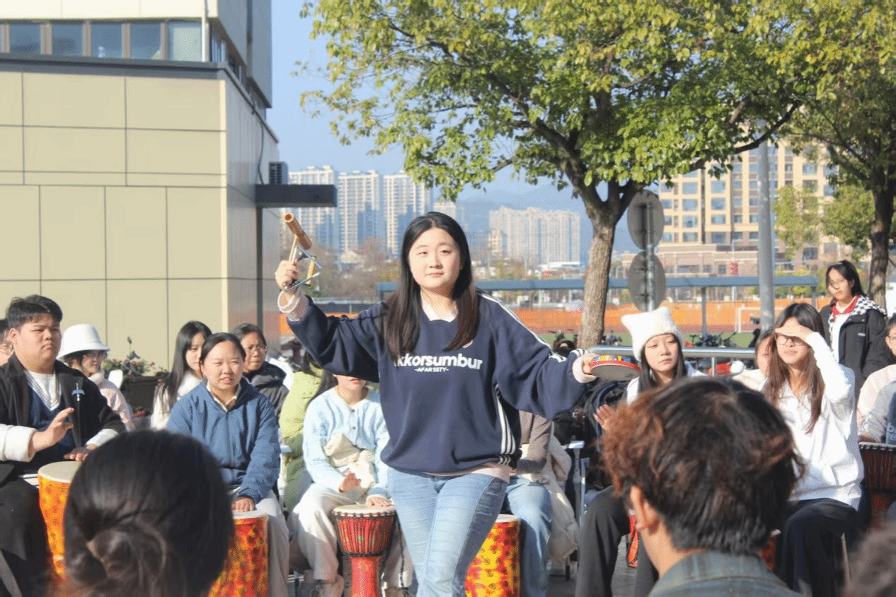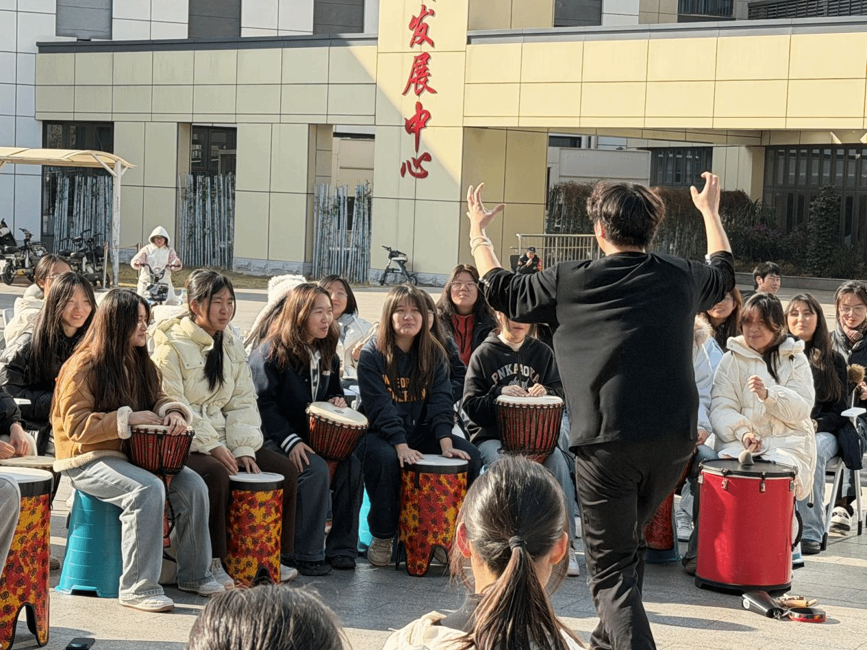 在专业引导师的带领下,同学们围坐成圈,手持非洲鼓、手鼓、沙锤等打击乐器,从简单的节奏模仿起步,逐步过渡到自由表达与多声部合奏。引导师巧妙运用节奏变化、强弱交替及互动呼应等技巧,充分激发参与热情。起初略显拘谨的鼓点,很快融合为充满活力与韵律的和谐乐章。激昂的节奏、欢快的旋律,与同学们专注投入的神情、舒展放松的笑容相映成趣,现场洋溢着热烈而温暖的氛围。