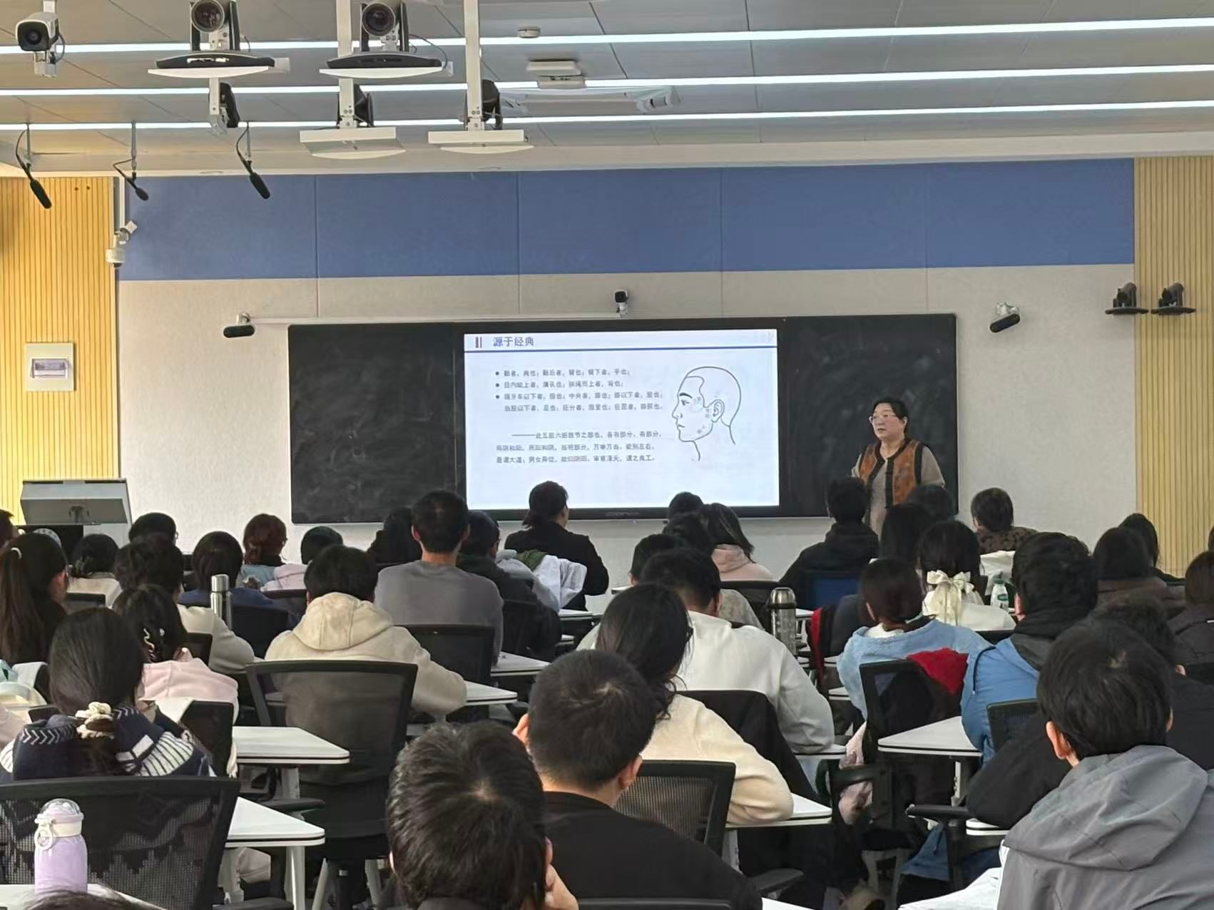 讲座期间,赵琛教授系统且全面地阐述了面针针刺手法的核心内容,并从四个方面进行了深入讲解:一是穴位的起源与历史演变;二是面部穴位的构成与定位方式;三是面针在临床中的实际应用,并结合具体案例进行了生动展示与分享;四是该技术的特点与未来发展走向。整场讲座逻辑清晰、深入浅出,既具备理论深度,又具有临床实操性,其丰富生动的内容激发了在场师生的浓厚兴趣,现场交流讨论氛围热烈。