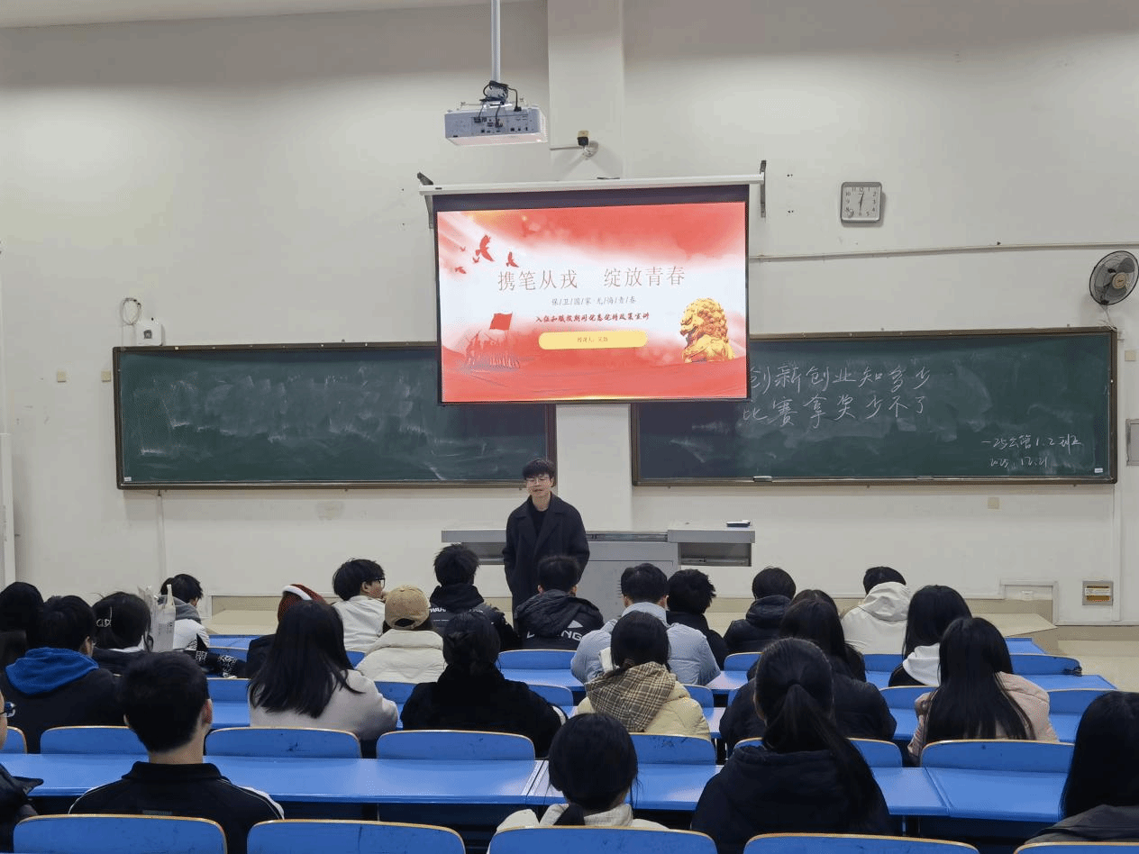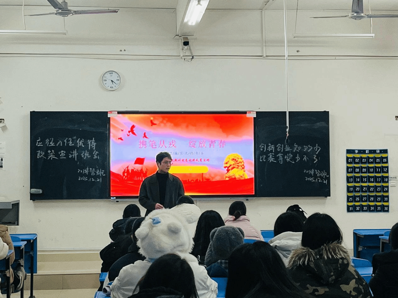 江中新闻网讯(通讯员 李超超)为鼓励应届毕业生响应国家号召、积极投身国防建设,12月21日,健康经济与管理学院以“线下 + 线上”结合的形式,面向2026届毕业班开展“携笔从戎 绽放青春”征兵入伍政策宣讲主题班会。