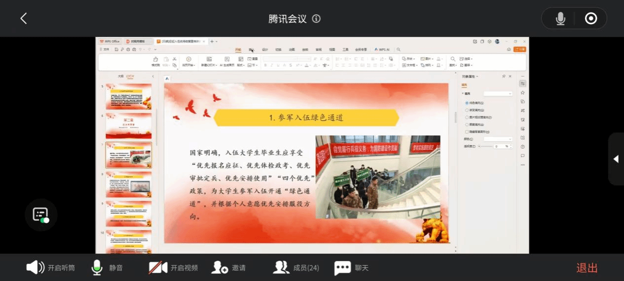 考虑到部分班级学生在外实习,本次宣讲同步开启腾讯会议线上直播通道,实习学生通过云端参与学习,实时了解征兵流程与政策细节,线上线下互动答疑,确保政策传递“全覆盖、无遗漏”。