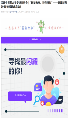 为帮助毕业生全面掌握招聘信息、提升求职针对性与成功率,药学院创新宣传方式,构建“线上+线下”多渠道覆盖的宣传矩阵。线上方面,将企业资料精心整理,打造系列公众号推文,以明晰的版式、详实的内容展现企业亮点与职位详情,便于毕业生随时查阅分享;依托毕业生微信群等精准渠道,定向发送招聘资讯,确保信息送达每一位求职学子。同时,对于有专场宣讲需求的企业,学院主动对接企业负责人,协调场地与设备资源,全力保障宣讲会顺利举办。线下方面,学院特别在学校各显示电子屏上滚动播放收集到的企业宣传视频,进一步扩大企业宣传影响力,帮助学生直观感知企业文化和岗位内涵。