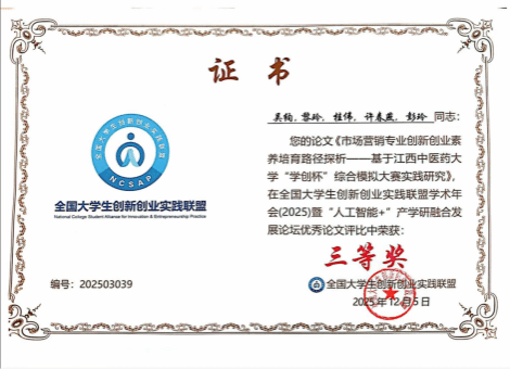 在本次年会上,辅导员蒋锋老师荣获创新创业指导教师优秀事迹,2023级市场营销(中外合作)班吴绚等撰写的《市场营销专业创新创业素养培育路径探析—基于江西中医药大学“学创杯”综合模拟大赛实践研究》荣获优秀论文三等奖。