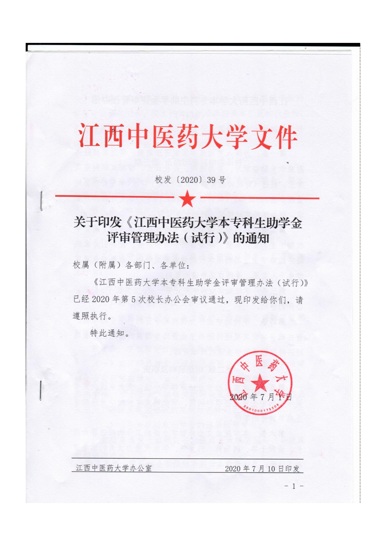 关于印发《江西中医药大学本专科生助学金评审管理办法(试行)》的通知